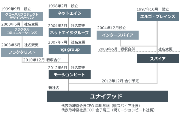 今のユナイテッドはすごいカッコいい会社だと僕は思ってるのですが、投資やインキュベーション事業、広告事業のモーションビート(旧 ネットエイジ)と、アプリ事業や広告事業のスパイアの2012年12月(4年前くらいですね)の合併によって出来ていて。